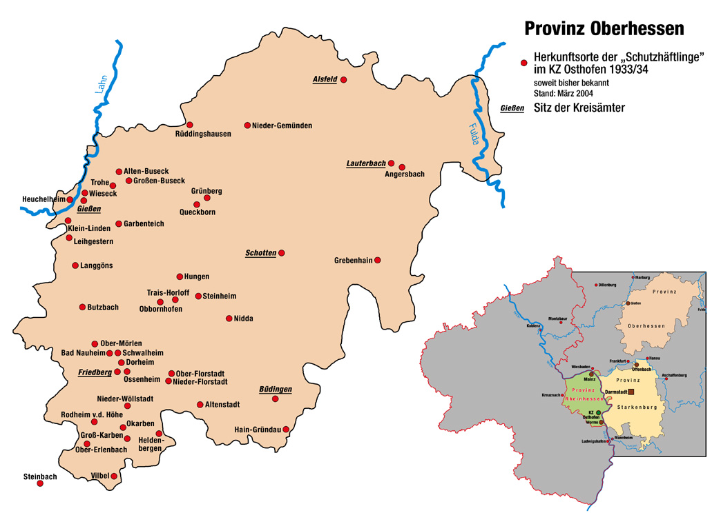 Auf der Grundlage der am 28. Februar 1933 erlassenen "Verordnung zum Schutz von Volk und Staat", die der Abwehr kommunistischer staatsgefährdender Gewaltakte dienen sollte, hatte der Staatskommissar für das Polizeiwesen in Hessen, der Nationalsozialist Dr. Werner Best, zum 1. Mai 1933 die Schaffung eines Konzentrationslagers für den damaligen Volksstaat Hessen in Osthofen bei Worms angeordnet. Dort hatten aber bereits Anfang März örtliche Nationalsozialisten eine leerstehende Papierfabrik beschlagnahmt und als Konzentrationslager genutzt.