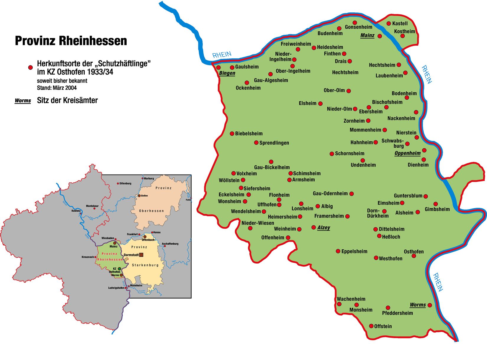 Die Schutzhaft sowie die Einweisung in das KZ Osthofen wurden in der Regel von den zuständigen Kreisämtern der damaligen drei Provinzen Rheinhessen (heute in Rheinland-Pfalz), Oberhessen und Starkenburg angeordnet bzw. verfügt. Verantwortlich war bis zu dessen Amtsenthebung im Herbst 1933 der Staatskommissar für das Polizeiwesen in Hessen, Dr. Werner Best, seit Juni 1933 im Amt des Landespolizeipräsidenten. Ab Oktober 1933 lag die Zuständigkeit beim hessischen Staatsminister Philipp Wilhem Jung. Aus nahezu allen Städten und Gemeinden des Volksstaates sind Häftlinge nachgewiesen.