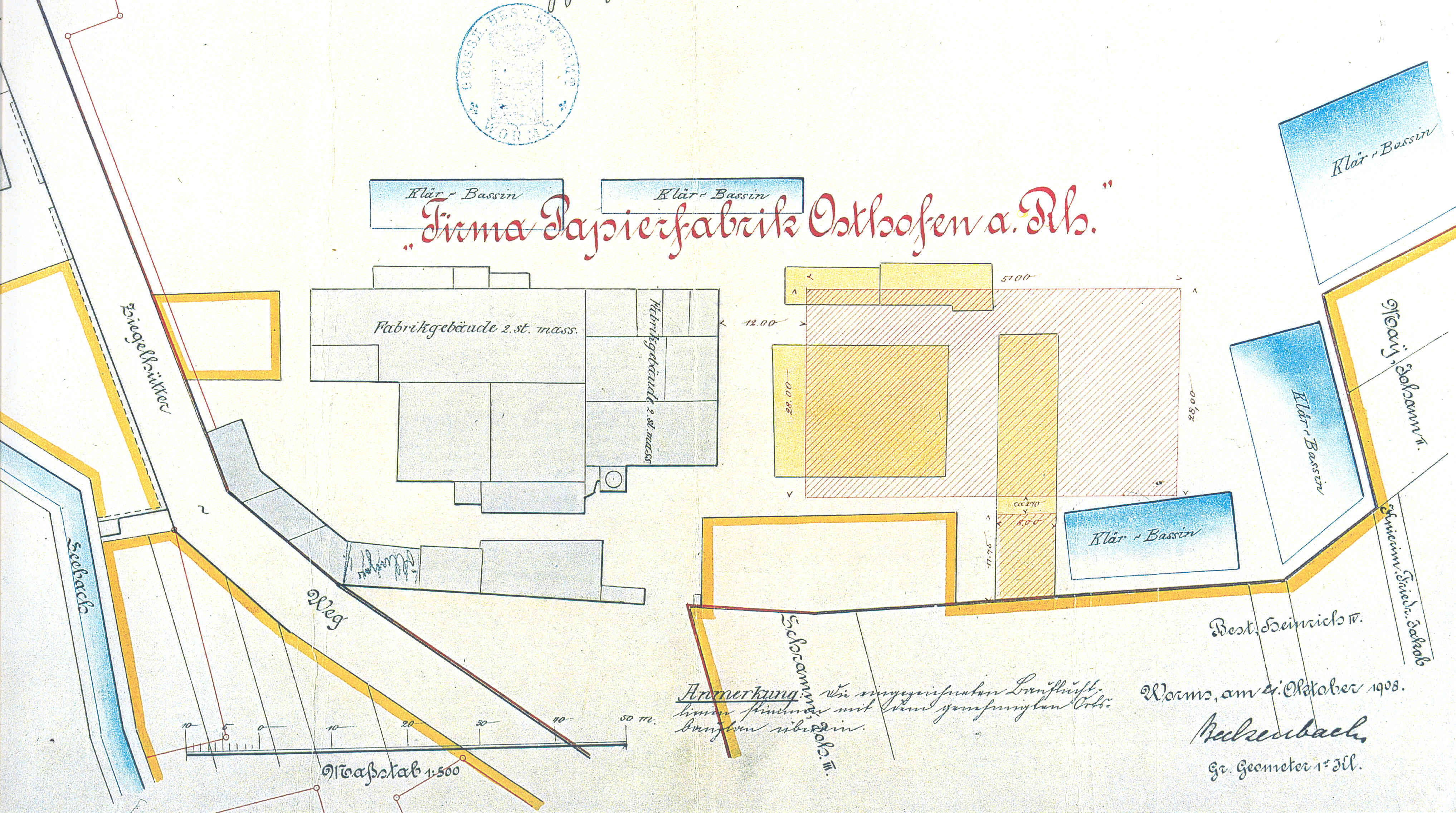1872 baute Gustav Rumpel am Ziegelhüttenweg in Osthofen eine „Papier- und Pappdeckelfabrik“. Spätestens ab 1893 gehörte das Gebäude zunächst als „Papier-Manufactur Mannheim“, später als „Papierfabrik Osthofen“, Joseph Kahn. Dieser baute das Gebäude immer weiter aus und ergänzte es 1908 um eine eingeschossige zweite Halle. 1911 wurde die Firma zur GmbH. Vertretungsberechtigter Teilhaber war der jüdische Fabrikant Karl Joehlinger aus Osthofen. 1925 wurde aus der GmbH die „Papierfabrik Osthofen Aktiengesellschaft“. Diese wurde Anfang der dreißiger Jahre stillgelegt.